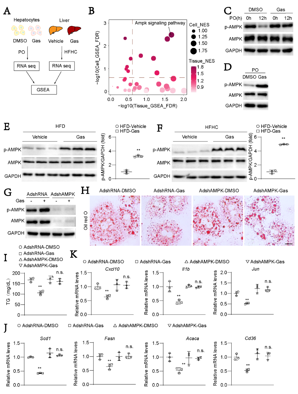 基因富集(GSEA)分析,发现天麻素主要激活AMPK通路。进一步研究采用特异性的抑制剂(化合物C)和shRNA干扰,证实天麻素主要通过AMPK通路逆转脂肪性肝炎。该研究筛选出脂肪肝炎的低毒高效治疗药物,发现了其新的作用靶点(图2)。
