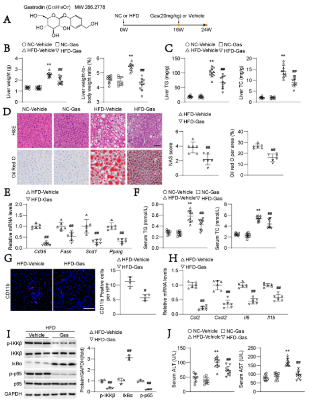 图1 天麻素缓解高脂饮食诱导的小鼠脂肪肝和肝炎
