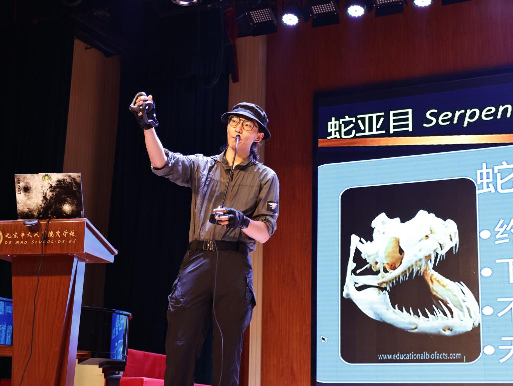 互动问答环节中,崔桐恺巧妙提出了“怎么样区分毒蛇和无毒蛇”的问题,激发了同学们的参与热情。在随后的环节中,工作人员展示了几种常见蛇类和蛙类的标本,供同学们轮流传递观察,增添了亲身体验的机会。其中,几位同学受邀上台,与无毒的加州王蛇和墨西哥黑王蛇进行了近距离接触,这不仅加深了同学们对科普内容的印象,也拉进了他们与两栖爬类动物的距离。