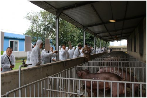 据悉,来自湖北、湖南、山东、陕西18个种猪场的243头种公猪参加了今年种猪拍卖会的角逐,测定猪群经我校农业部种猪质量监督检验测试中心(武汉)在相同的营养水平、设施设备和环境条件下进行饲养管理,按统一的行业标准获取每一个体的测定数据,计算每一个体的校正活体背膘厚、校正日增重、饲料转化率和综合指数,指数排序前十的个体由专家进行外形评定,按照“综合指数排序前5名、专家组外形评定排名前3名”的规则遴选出18头特优级种公猪公开拍卖,此外,94头优级种公猪参加了暗标竞购。