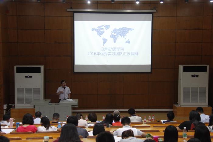 (通讯员:李晗 供图:李浩宇) 9月27日晚7点,学院2016年生产实习总结暨表彰大会在三教S2报告厅举行。校学生工作部副部长瞿明勇,校团委副书记刘立军,学院教学督导组组长王桂芝教授、副院长胡丽华及专任教师代表应邀出席担任评委。学院2016年生产实习团队成员及其他年级学生参加了会议。评选大会由动科动医学院副院长周锐主持。