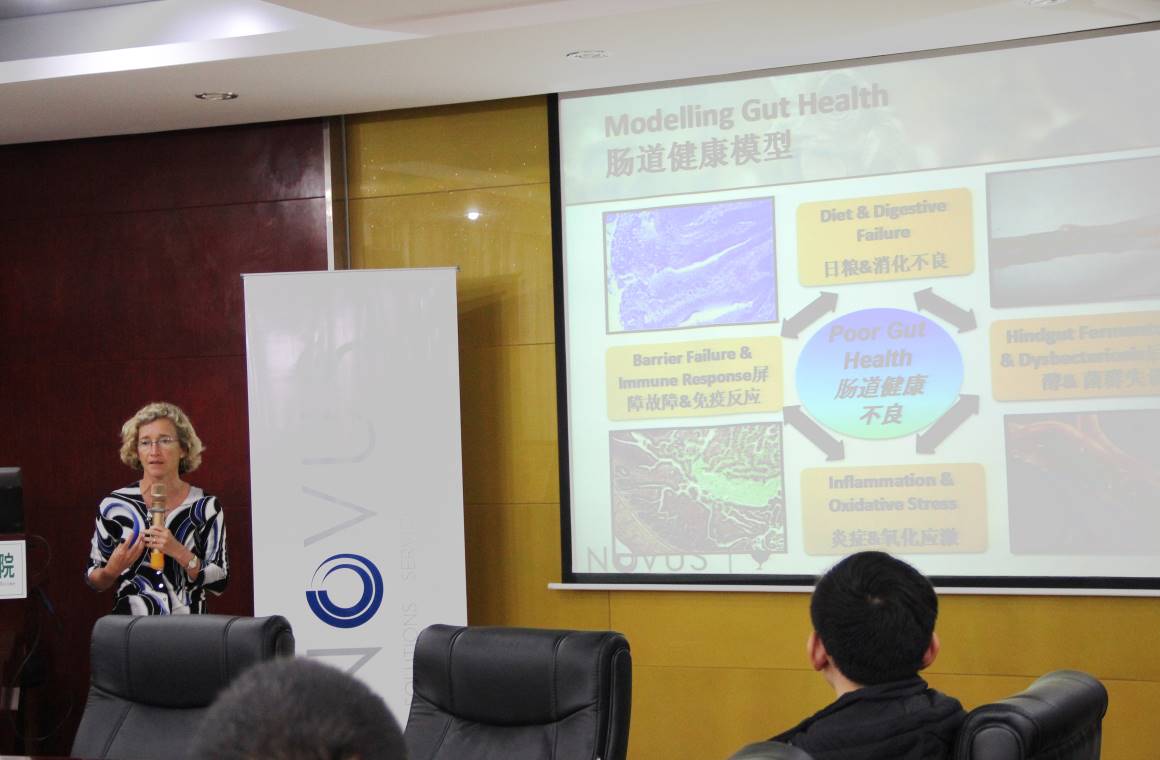 Mercedes V.A博士和陈巨星博士随后分别做了题为《优化肠道健康的营养策略》和《肉鸡鸡肉品质的挑战及研究进展》的报告。Mercedes讲到,肠道健康在家禽业中具有至关重要的地位。若无法采取有效措施保障家禽的肠道健康,会对企业造成巨大的经济损失。她通过建立家禽肠道健康的模型,改善日粮对家禽肠道应激进行营养干预,从而促进肠道健康。陈巨星介绍了在肉鸡肉质方面,从发现问题、到解决问题的全过程。在日粮中添加抗应激因子,降低肉鸡体内应激水平,从而改善肉质。两位报告人与在场听众分享了全球动物营养的最新研究发展动态,并与大家做了深层次的交流。据悉,两位报告人是诺伟司公司研发领域的佼佼者,能够与一家国际知名企业的高级研发人员进行面对面的交流,与会同学们纷纷表示获益匪浅,不仅开拓了视野,了解了全球动物营养的最新研究发展动态,更打开了思路,培养了科研思维。2016年NGS获奖者宋彤星博士随后为大家分享了赴美实习经历。他讲到通过去诺伟司总部实习,获得了与外籍专家交流、与国际企业接轨的机会,培养了自己思想的前瞻性、开拓了视野,获益匪浅。据了解,动科动医学院近年来力争提升校企合作档次,走出中国,向高层次的、国际化的校企合作迈步前进。