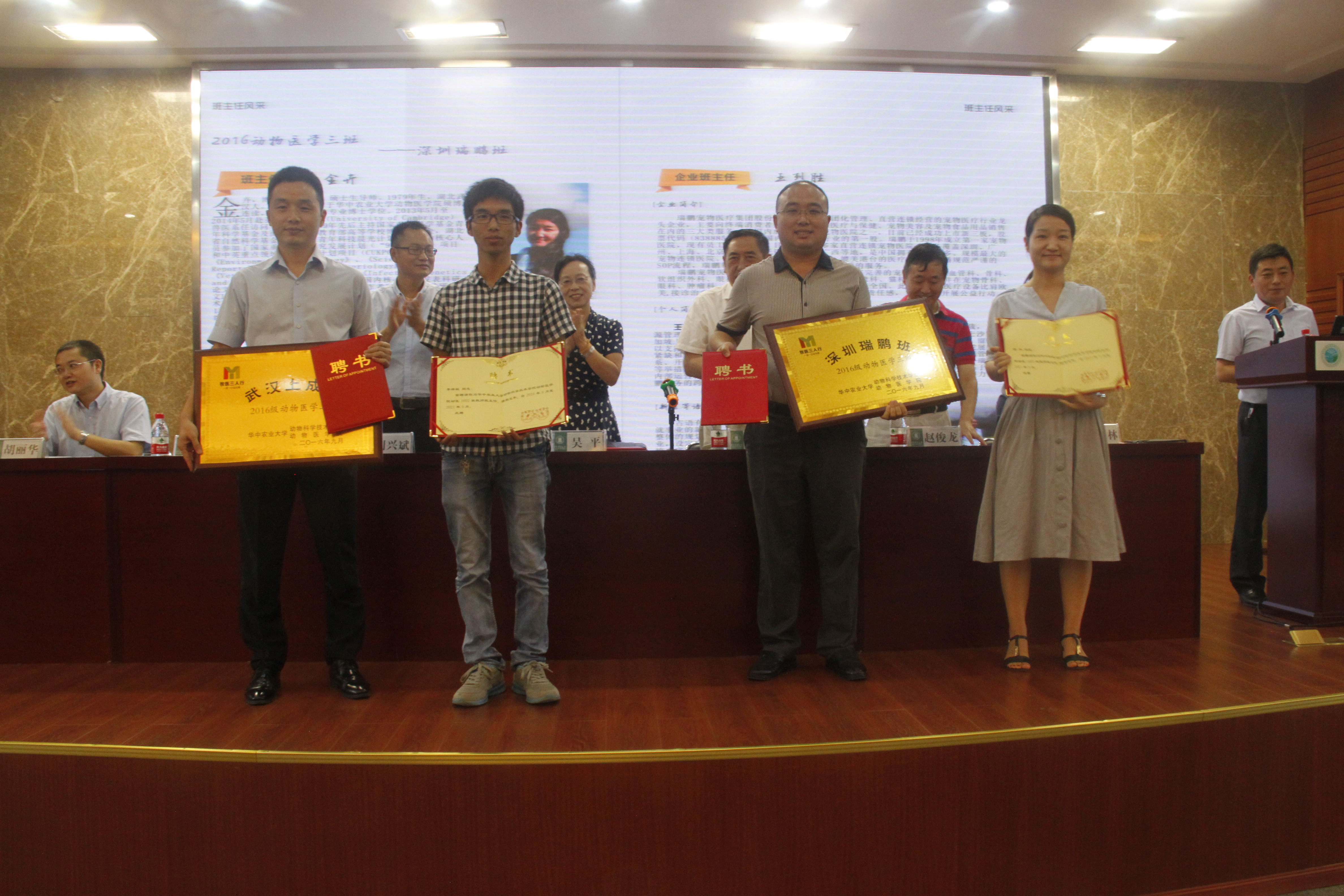 动科动医学院党委书记刘兴斌宣读了《关于在2016级本科生中设立企业班级暨聘任企业班主任、教师班主任的通知》,决定在2016级动物科学专业本科生中设立“正大班”等5个企业班级,聘任武汉正大有限公司总经理向卢晏等5人为企业班主任;在2016级动物医学专业本科生中设立“大连三仪班”等6个企业班级,聘任大连三仪动物药品有限公司董事长江庆国等6人为企业班主任,聘期5年。会上,为企业班授牌并为企业班主任、教师班主任颁发了聘书。