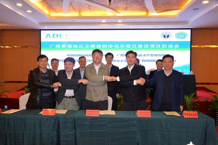 11月10日,广西贵港地区主要猪病净化示范区建设项目启动会在广西贵港举行,中国动物疫病预防控制中心、广西壮族自治区畜牧水产局、贵港市人民政府、云顶国际4008am、广西扬翔股份有限公司等五方签订框架合作协议,共同建设全国首个主要猪病净化示范区。副校长姚江林代表云顶国际4008am签约,中国工程院院士陈焕春教授出席启动仪式并讲话,动科动医学院党委书记刘兴斌、副院长李育林以及程国富教授、吴斌教授、钱平教授参加启动会。