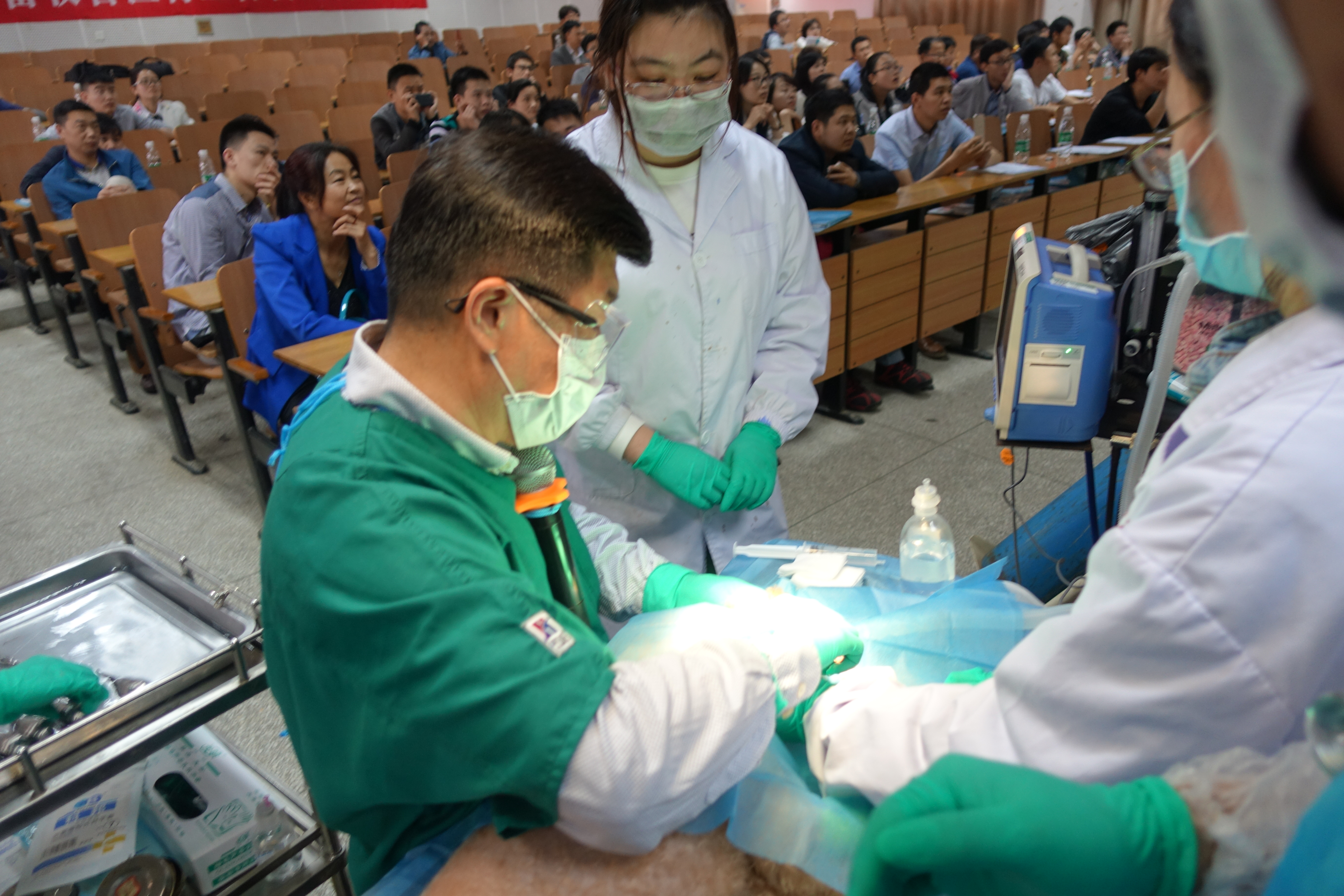 开幕式结束后,牙科专家韩琦先生先就《如何正确建立完善的宠物牙科诊疗系统》和《临床如何拓展宠物牙科业务而迅速提高兽医》做了生动详细的报告,随后以我校兽医院收治的一例9岁贵宾犬牙结石自然病例在培训现场做了牙科实操以及牙科问题答疑与交流,手术具体操作流程现场录影并实时投影到大屏幕,清晰地展示给全场人员观摩学习,上午的培训活动至此达到高潮。