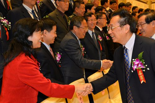 全国人大常委会副委员长陈昌智与金梅林教授(左一)握手