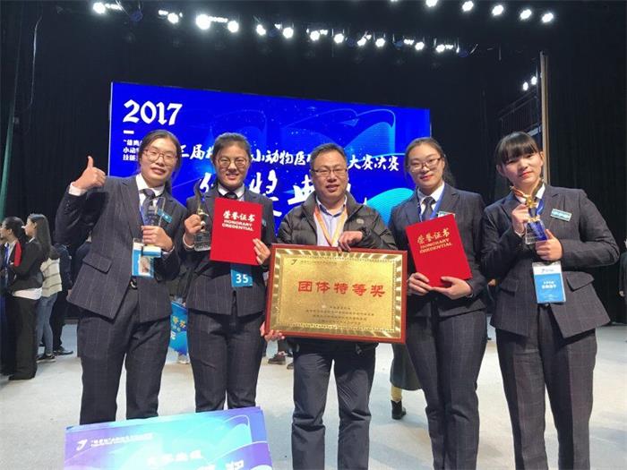大学生组的比赛分为理论知识竞赛和手术实操竞赛两部分,主要考察动物医学专业大学生必须掌握的基础知识和专业技能。为了此次比赛学院组成了以胡长敏老师为领队,丁一、刘东明等多位老师组成的指导团队,动物医学专业本科生尹伊娅、李婷、刘爱、赵雯雯四位学生为参赛队员的代表队。经过近两个月的紧张准备和两天的激烈角逐,同学们在比赛中分工明确、配合默契,展示了扎实的专业知识和过硬的动手能力,表现突出,荣获团体特等奖,尹伊娅同学还获得了“中国兽医新星”的个人奖项。此外,胡长敏、丁一、刘东明三位老师获得“优秀辅导老师特等奖”,胡长敏老师还获得“中国新时代临床兽医教育“优秀园丁奖”。