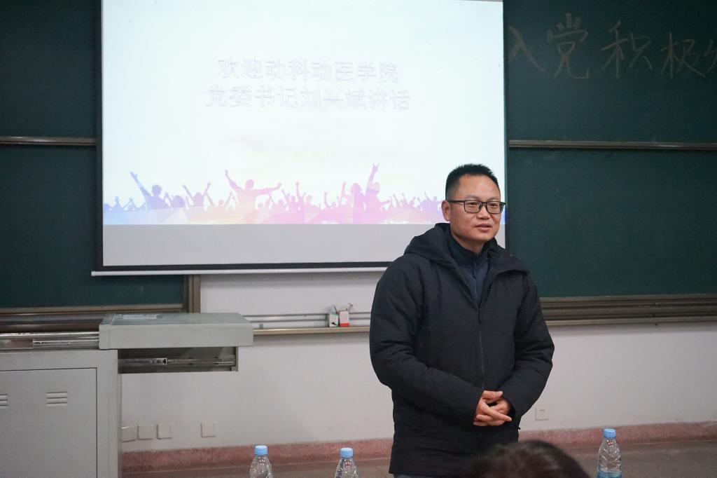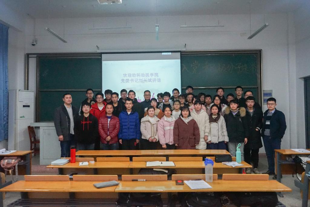 班会最后,刘兴斌与学生亲切交流。他首先解释了参与班会的原因,在2018年年终述职考评会上,向学院领导、老师提出要求,应积极参与学生活动,与学生进行面对面交流,了解学生所思所想。通过对学生的了解与交流,从而选择立德树人工作中更优的切入点与更有效的方式方法,加强学院建设、改善政策条件,使学生发展更好,为社会做贡献。接着刘兴斌简述了过去入党与现在入党流程上的差异,强调了民主选举的重要性,要成为党员需要通过民主选举得到大众认可。民主是中国共产党的优势,党是无私的,是为人民着想的。谈及兽医畜牧行业发展方向,刘兴斌表示人工智能是畜牧行业未来不可或缺的技术。因此需要畜牧专业学生不仅学习专业知识,也掌握其他领域知识,还有管理学知识等。讲话最后,刘兴斌鼓励学生们:“为行业产业发展而学,为今后科研、给人类提供优质动物蛋白而学,为人类健康发展而学。”