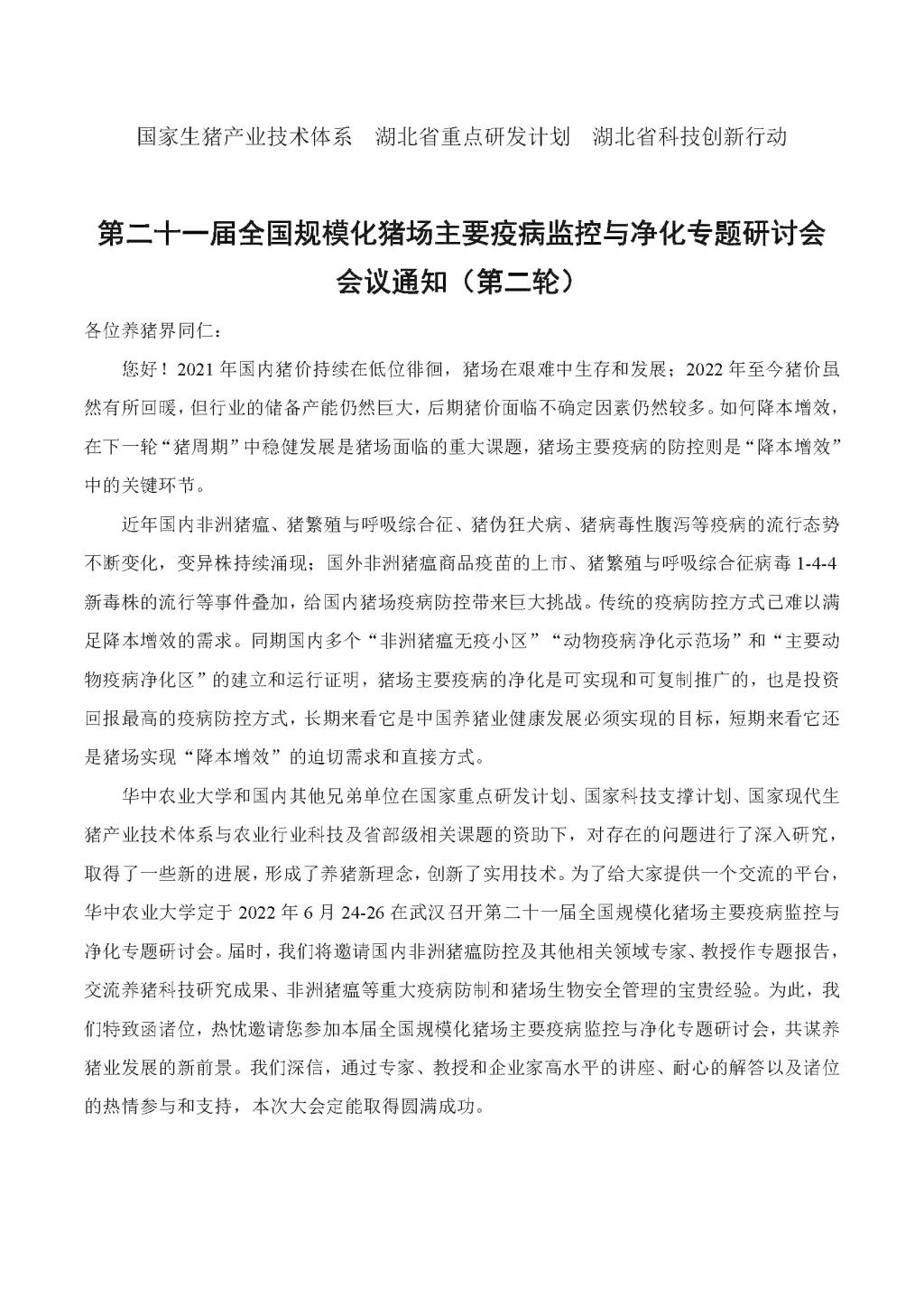第二十一届全国规模化猪场主要疫病监控与净化专题研讨会会议通知(第二轮)