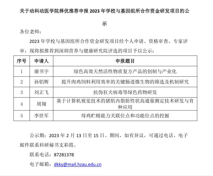 关于动科动医学院择优推荐申报2023年学校与基因组所合作资金研发项目的公 示