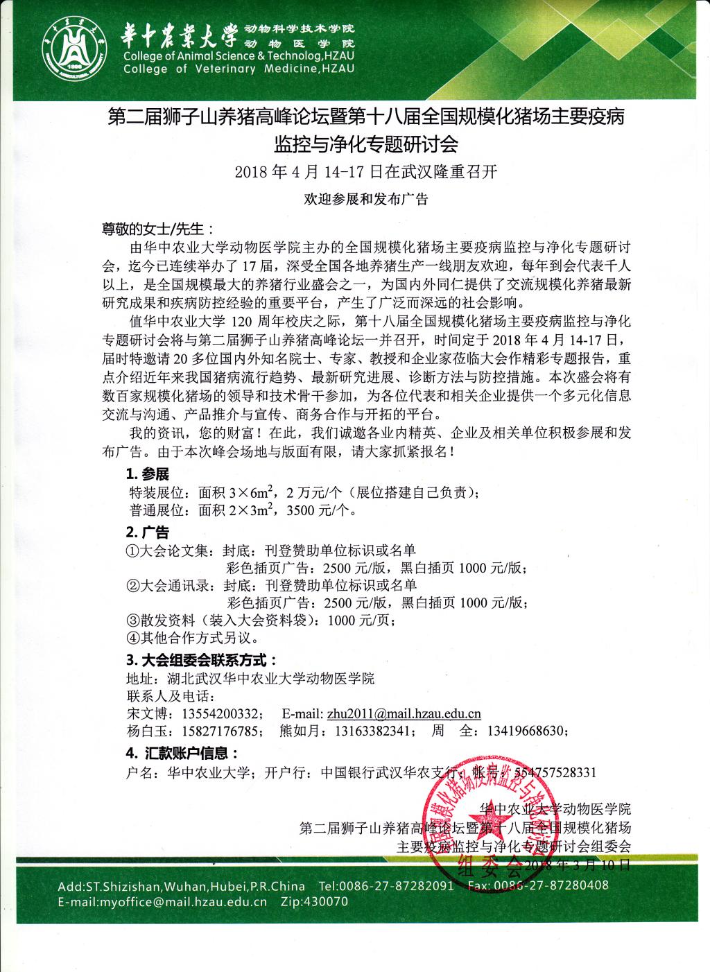 第二届狮子山养猪高峰论坛暨第十八届全国规模化猪场主要疫病监控与净化专题研讨会参展与宣传邀请通知