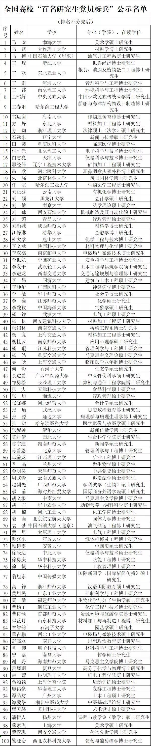 根据《教育部办公厅关于开展高校“百个研究生样板党支部”和“百名研究生党员标兵”创建工作的通知》(教思政厅函〔2018〕28号)安排和评审工作方案,经组织推荐、专家通讯评审、教育部党建工作领导小组成员单位集中审议,遴选产生了100个研究生样板党支部,100名研究生党员标兵。现将名单予以公示(见附件)。