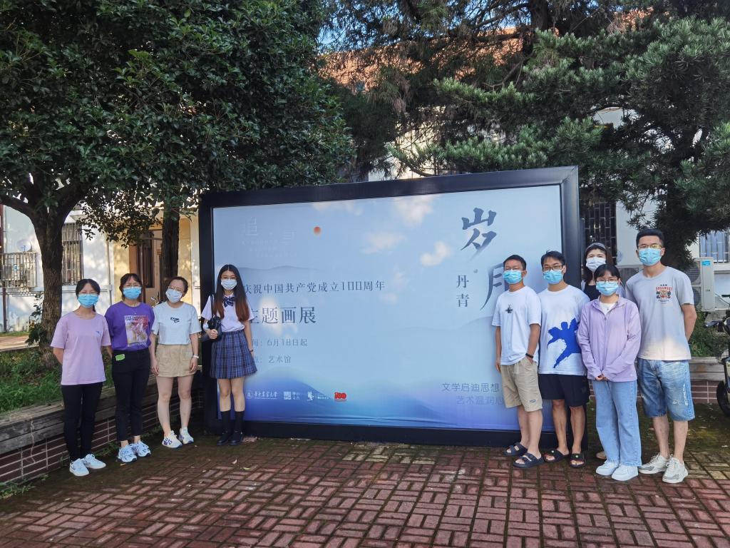 由党支部书记莫心宇同志带领全体党员唱国歌、重温入党誓词,然后进入校艺术馆参观。党员同志们欣赏了诸多艺术家绘制的关于中国共产党成立100周年的画作。其中,有讲述2020年中国抗疫故事的作品、有革命英雄的肖像画、还有结合中国传统文化讲述党的故事的特殊作品等,将这百年来我们党经历的种种苦难、创造的种种成就生动形象地描绘出来。艺术家们用笔触讲述了党带领人民进行革命、建设、改革的故事,用各种色彩告诉了我们当今幸福生活的来之不易。